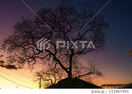 日没後グラデーションになった美しい夕焼け空とシルエットになった公園のナンキンハゼ 奈良市内の公園にて