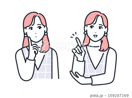 指差しで考えるおしゃれな若い女性のシンプルなベクターイラストセット素材