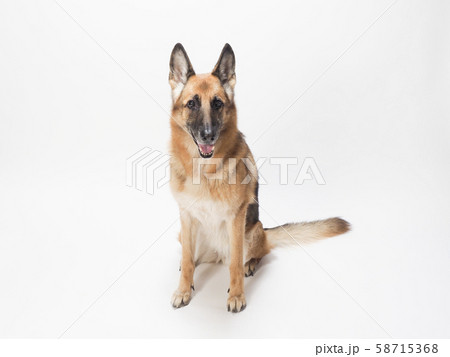 白い背景に立つジャーマン・シェパード・ドッグのポートレート|ペットと動物の写真素材 犬図鑑