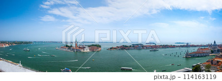 高所から望む古い建造物の並ぶ島々 (イタリア、ヴェネツィア、サンマルコ鐘楼から見るヴェネタ潟)