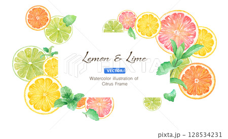 シトラスとミントの水彩イラスト。オレンジ、レモン、グレープフルーツ、ライムのフレームデザイン
