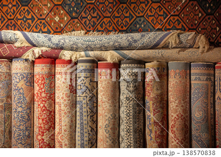 Colorful rolls of traditional rugs displayed in an artisan shop showcasing intricate patterns and craftsmanship in a vibrant market