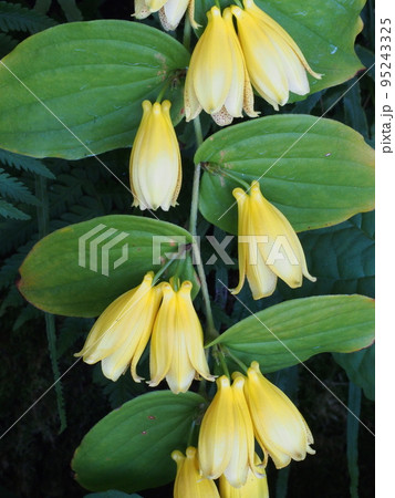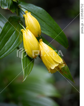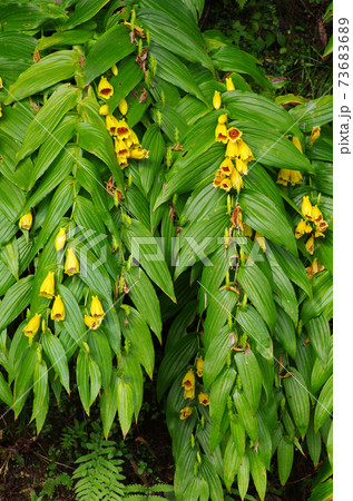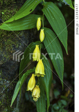 紀伊山地の湿った崖に生える黄色の釣鐘状の花が並んで咲いている姿が美しいキイジョウロウホトトギス
