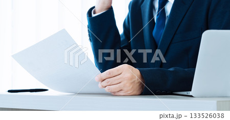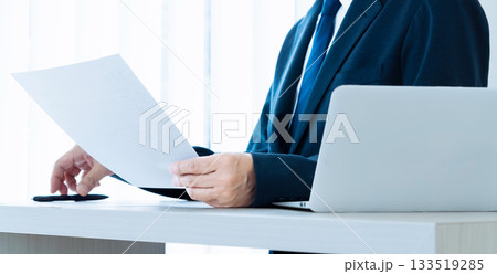 ベンチに座り、本を読むスーツを着た男性(目線なし)