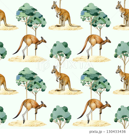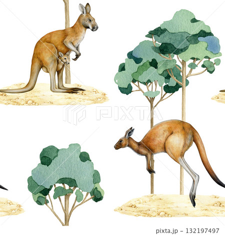 Kangaroo animals with gum trees landscape element hand drawn seamless pattern. Australia native marsupial mammals vintage style painted illustration. Cute kangaroos seamless pattern design