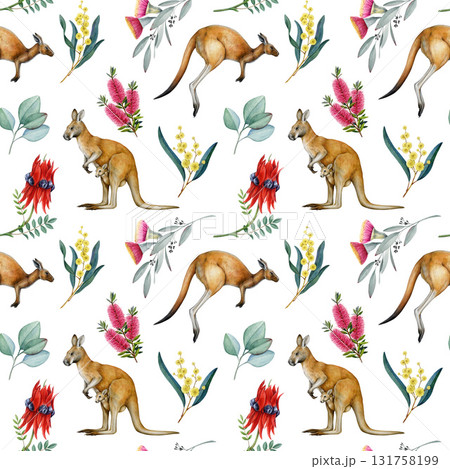 Kangaroo with Australian flora elements hand drawn seamless pattern element. Cute kangaroos with Australia native flowers seamless pattern design for packaging and wrapping paper