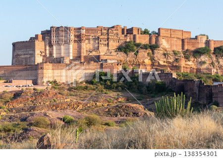 Mehrangarh Fort at the golden hour with the adjacent rocky landscape, Jodhpur, Rajasthan, India
