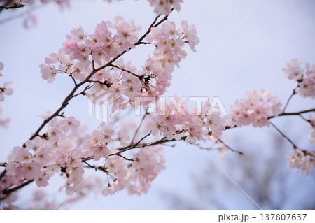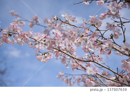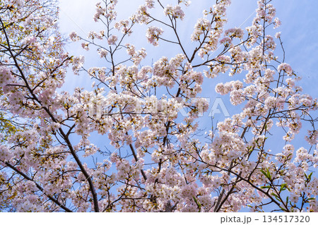 春の陽射しを浴びる満開の淡いピンク色のジンダイアケボノ桜