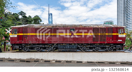Malayan Railways locomotive 22102 exhibit in front of National Museum of Malaysia, Kuala Lumpur, Malaysia, with Merdeka 118.