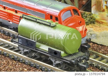 Detailed model of a green tank car with a red locomotive on a miniature railway track. A close-up view showcases a meticulously crafted green tank wagon alongside a vibrant red model train engine, set