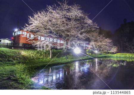 夜の小湊鐡道飯給駅から桜と菜の花畑を走る機関車