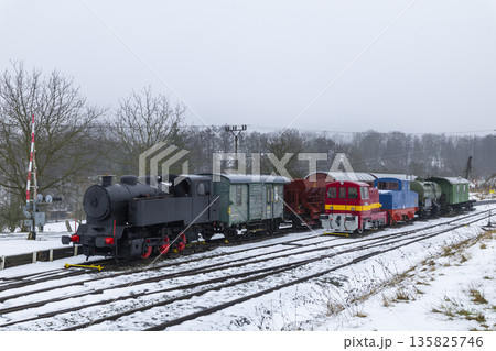 Vintage trains parked on snowy tracks in Zubrnice, Czechia
