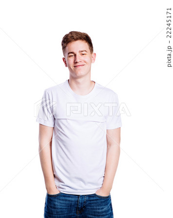 Boy in jeans and t-shirt, young man, studio shot
