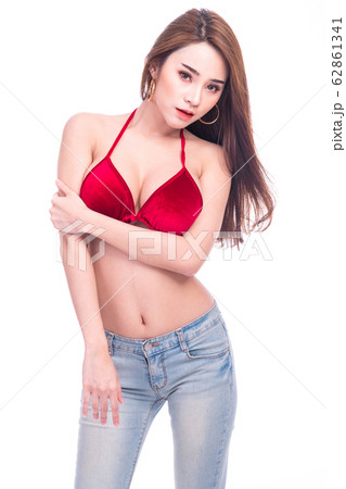 Cute asian woman in red bikini and jeans isolated