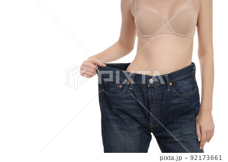 Happy slim woman showing her weight loss