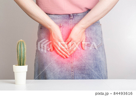 A cactus on the background of a woman in a denim skirt is holding her anus with her hands. Bowel problems, constipation and diarrhea concept. Obstructed bowel syndrome