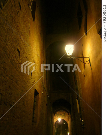 イタリア/シエナ 煉瓦の壁が続く夜の街並み