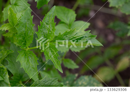Valeriana officinalis, valerian, new plants at spring. Young green leaves of a medicinal plant
