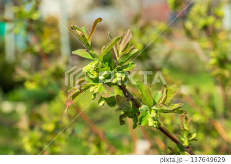 Close-up of honeysuckle flower buds blooming on bush branch in spring.