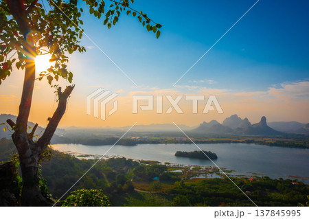 Landscape of Mountains and lakes in sunset at Phu Sub Lek Reservoir, Lopburi, Thailand. A new attraction that is highly popular.
