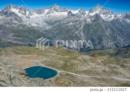 Grimsel Pass Road, with view of Grimselsee and Raterichsbodensee, Canton of Bern, Switzerland
