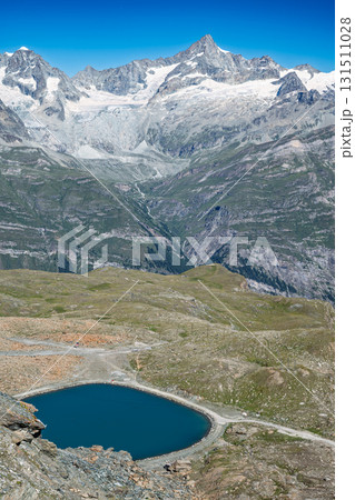 Landscape with the artificial lake and weir of lac de Moiry in Switzerland during summer