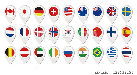 各国の地図ピンアイコンセット 国旗 ベクターイラスト