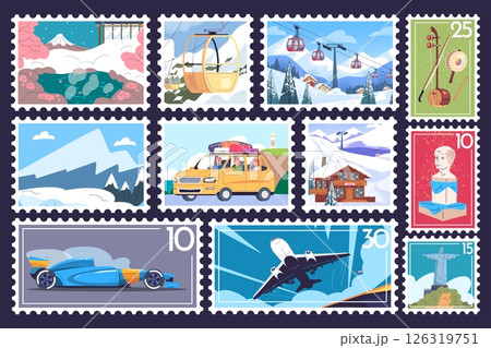 Travel postage marks. Touristic postcard postage stamps, summer vacation letter mail post stickers with attractions Japan Brazil mountains snow ski resort mark vector illustration