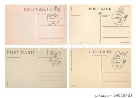 Vintage postcards and post card templates from Oslo, Copenhagen, Bern and California. Vector postcards reverse backgrounds with postal stamps of Norway, Denmark, USA or Switzerland travel post cards