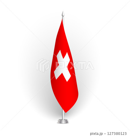 Switzerland flag - 3D standard conference flag hanging on ground flagpole. Usable for summit, indoor meeting, board room, government office, press room or reception. Vector flag with shading