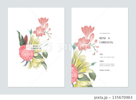 Floral wedding invitation card template design, various yellow and white flowers on pink
