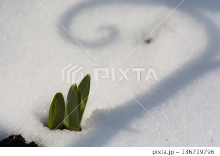 雪が残る庭から芽を出したスイセン