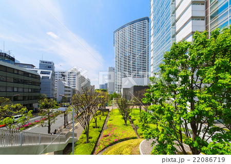 若葉と新緑の品川インターシティと品川グランドコモンズ