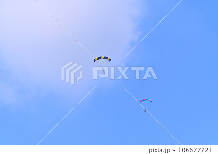 爽やかな青空の中スカイダイビングを楽しむ人たち