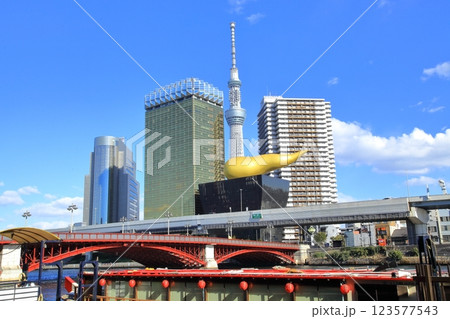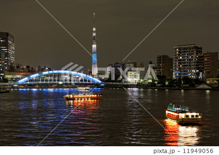 隅田川の屋形船とライトアップのスカイツリーと永代橋