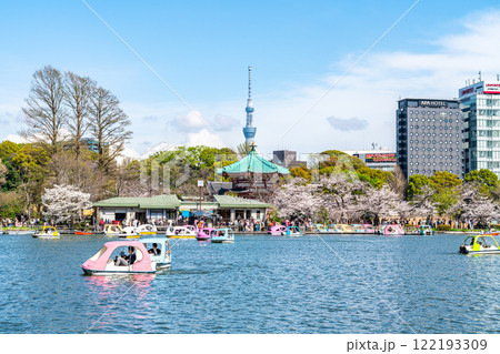 上野の不忍池のレジャーボートと辯天堂、東京スカイツリー