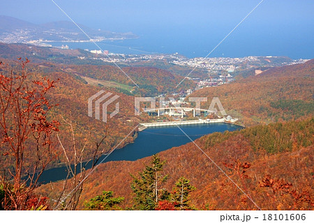 朝里ダムから紅葉に包まれた朝里スカイループの見える秋景色 ( 北海道 小樽市 )