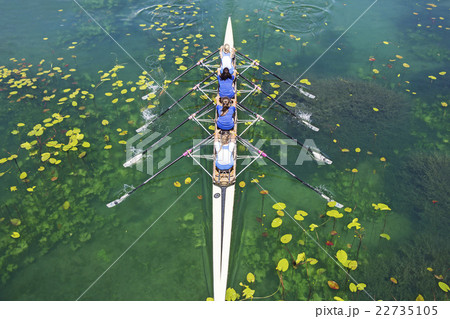 Four Womens rowing team on blue lake, Aerial view