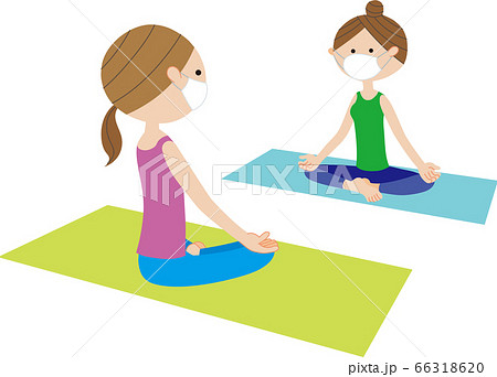 マスクをしてスカ・アーサナ(安楽座のポーズ)のポーズでヨガレッズンを受ける女性2人