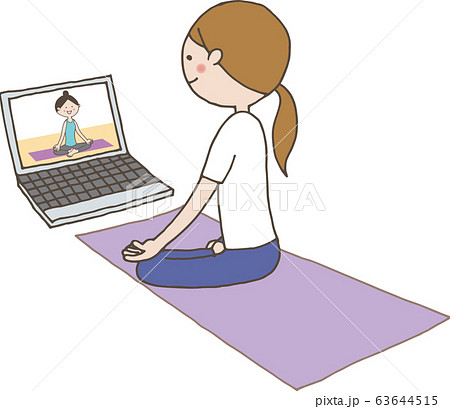 ノートパソコン画面に映ったスカ・アーサナ(安楽座のポーズ)のヨガポーズをする女性