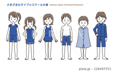 さまざまなタイプのスクール水着を着用した小学生 シンプルなイラストセット