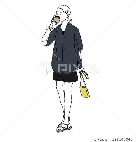 ショートパンツコーデでコーヒーを飲みながら歩く女性の線画イラスト