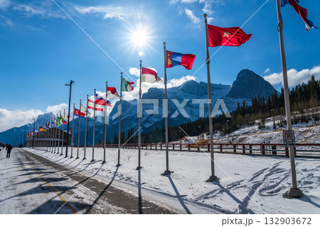 冬のキャンモア・ノルディック・センター州立公園。アルバータ州、カナダ