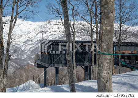 石打丸山スキー場のリフト降り場にあるレトロな看板と施設 (新潟県、南魚沼市、石打丸山)