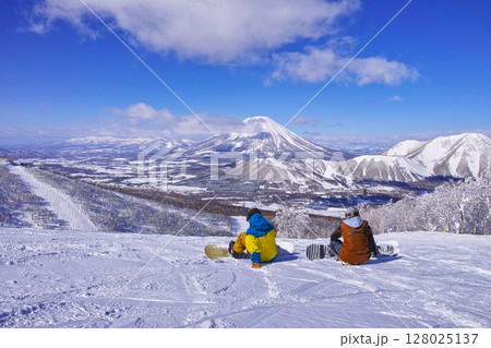 真冬のルスツスキー場、羊蹄山を眺める休憩中のスノーボーダー達
