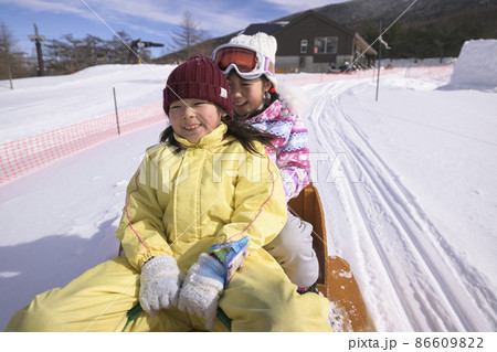 スキー場のゲレンデで雪遊びする小学生の女の子