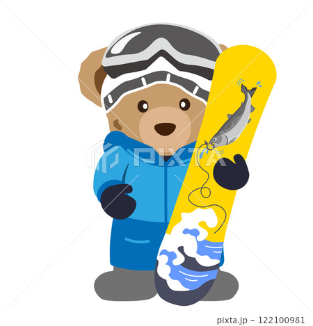 スノーボードの板をもって立っているクマのぬいぐるみのイラスト