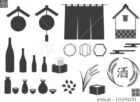 日本酒・酒蔵イメージのイラストアイコン Japanese sake白黒