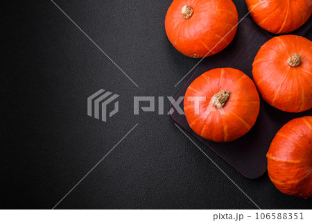 Beautiful fresh round pumpkins in orange color on a dark concrete background