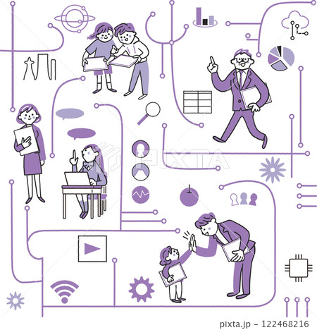 ICT教育とネットワークで繋がる人々 ITのシンボリックなアイコンのセットのストックイラスト素材